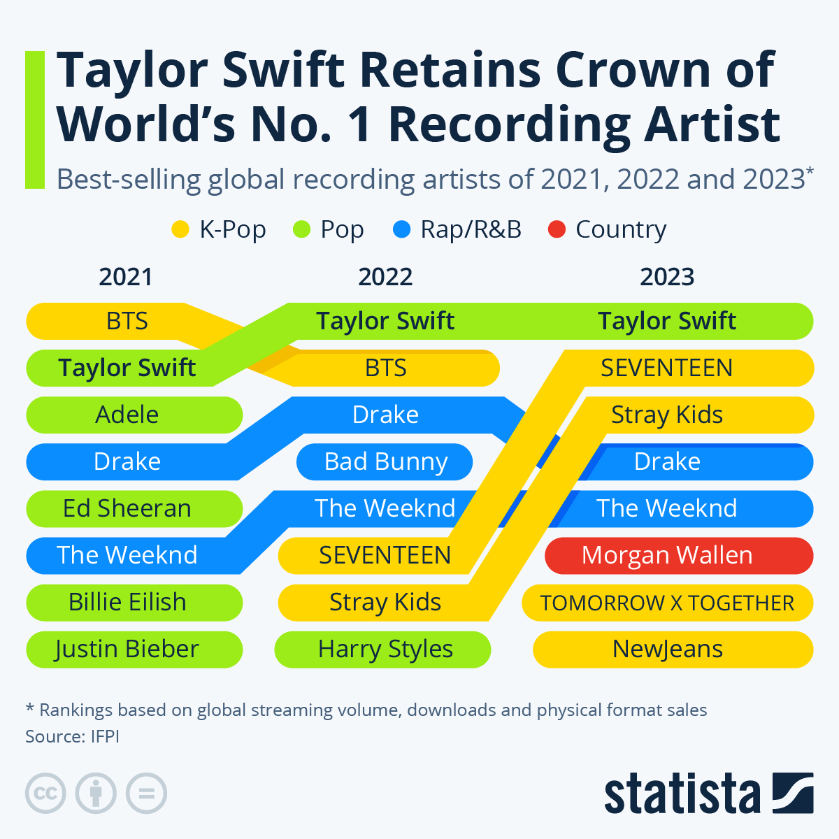 Seperti yang ditunjukkan dalam grafik, Swift menduduki puncak daftar artis terlaris di dunia untuk kedua kalinya berturut-turut setelah berada di posisi kedua di belakang sensasi K-Pop BTS pada tahun 2021. Sementara BTS keluar dari daftar 10 besar tahun ini karena dinas militer mereka, aktor K-Pop lain seperti SEVENTEEN, Stray Kids, dan TOMORROW x TOGETHER membuat kehebohan besar pada tahun 2023, dengan bintang country yang sedang naik daun, Morgan Wallen, juga baru masuk dalam 8 besar. Selain Taylor Swift, satu-satunya konstan lainnya dalam peringkat ini adalah Drake dan The Weeknd, yang telah menjadi artis terlaris di dunia dalam tiga tahun terakhir.