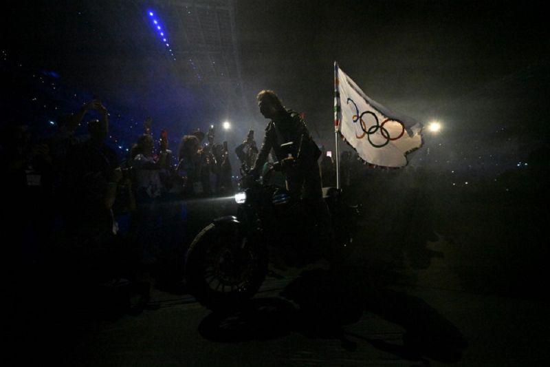 Dalam acara yang menegangkan tersebut, Tom Cruise melanjutkan penampilannya dengan mengendarai sepeda motor, membawa bendera Olimpiade, disambut sorak sorai meriah dari para atlet dan penonton. Sebelumnya, sebuah segmen video yang direkam menunjukkan Cruise mengendarai sepeda motor di jalanan Paris, menaiki pesawat terbang, dan melompat dengan parasut ke Los Angeles, menghiasi ikon tulisan Hollywood dengan cincin Olimpiade.
