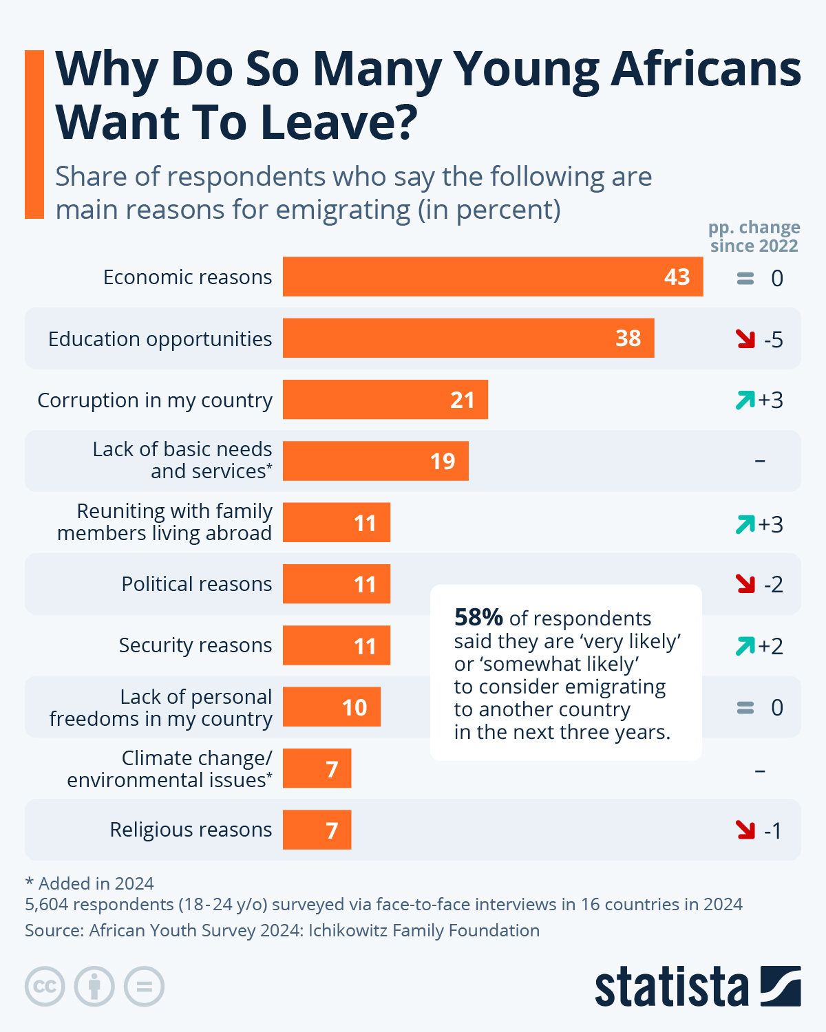 Semakin banyak anak muda di Afrika yang mempertimbangkan untuk meninggalkan negara mereka dalam beberapa tahun mendatang. Berdasarkan African Youth Survey 2024 yang dilakukan oleh Ichikowitz Family Foundation, hampir tiga dari lima anak muda Afrika mengaku sangat atau cukup berencana untuk beremigrasi. Hal ini menunjukkan peningkatan sebesar tujuh poin persentase dibandingkan survei tahun 2022.