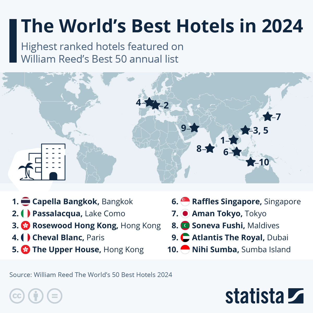 Hotel ini berhasil melonjak 10 peringkat dari tahun 2023, mengalahkan Passalacqua di Danau Como, Italia, yang kini berada di posisi kedua. Passalacqua sendiri merupakan hotel yang menawarkan suasana klasik dengan 24 kamar di dalam vila abad ke-18 yang dikelilingi taman bertingkat. Di posisi ketiga, terdapat Rosewood Hong Kong yang berada di gedung setinggi 65 lantai dengan pemandangan pelabuhan dan 11 restoran modern.