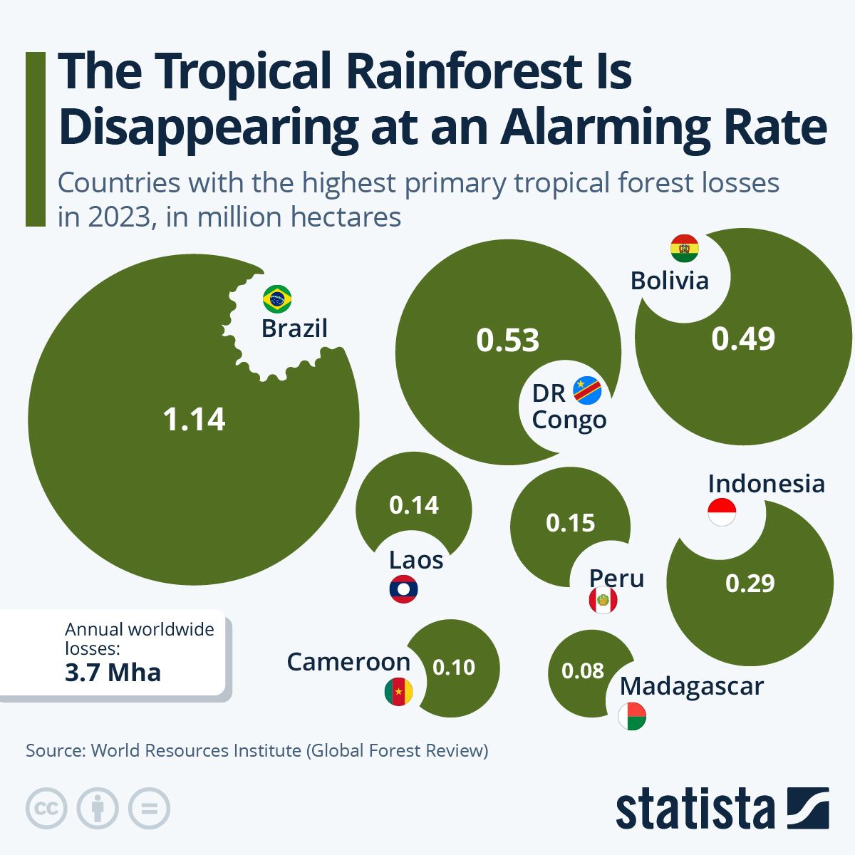 Brazil menjadi negara dengan tingkat deforestasi hutan tropis tertinggi di dunia. Pada tahun 2023, Brazil kehilangan 1,14 juta hektare hutan primer, yang jauh melampaui negara-negara lain dalam hal luas area hutan yang hilang. Penyebab utama deforestasi ini berkisar dari aktivitas pertanian skala besar hingga eksploitasi sumber daya alam. Hutan Amazon, yang sebagian besar berada di Brazil, merupakan rumah bagi ribuan spesies flora dan fauna serta menyimpan cadangan karbon yang sangat penting bagi keseimbangan iklim global. Namun, peningkatan permintaan lahan untuk pertanian, terutama kedelai dan peternakan, mengancam keberlanjutan hutan ini dan ekosistem di dalamnya.